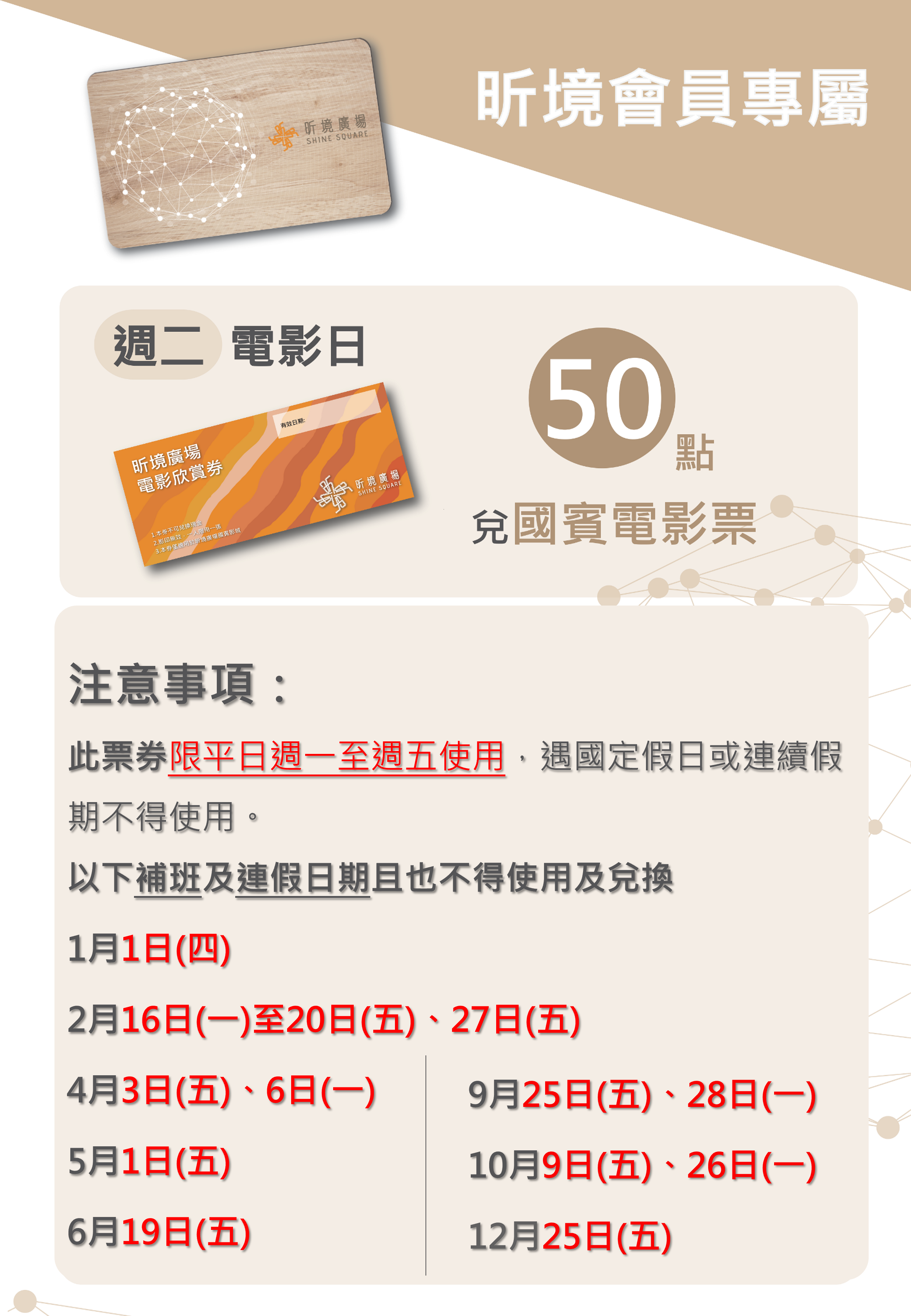 每週二,憑昕境廣場會員點數50點即可兌換昕境廣場-國賓電影欣賞券(價值300元)。